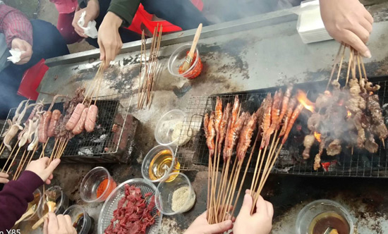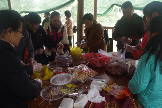 10:30分,我們正式抵達(dá)目的地“竹泉島山莊”,大家紛紛參與到午餐的準(zhǔn)備活動(dòng)中,生火、穿菜、刷油、配料、烤串……,大家紛紛施展各自拿手絕活,忙得不亦樂乎,不一會(huì)大家親手烤制的肉串就飄出陣陣誘人的香氣。太陽很應(yīng)景在此刻從云層中鉆出,金色的光芒透過樹蔭照在每個(gè)朝氣蓬勃的笑臉上。