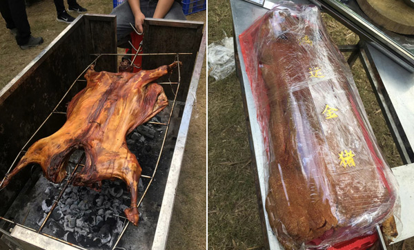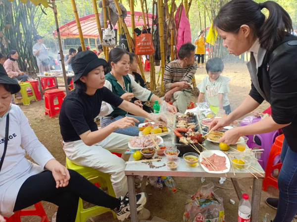 11:30體育運(yùn)動(dòng)結(jié)束后,大家來(lái)到燒烤場(chǎng)進(jìn)行自助燒烤。燒烤場(chǎng)座落在綠蔭濃濃的竹林中,雖是冬日,卻煦日暖暖,溫和的陽(yáng)光打在竹葉上,落下斑駁的日影,清風(fēng)襲來(lái),沁人心肺。燒烤場(chǎng)里飄香四溢的烤全羊、外酥里嫩的烤香豬、肥肥的雞腿、嫩嫩的雞翅、勁頭十足的牛肉丸,還有火腿、茄子、玉米、青椒等早已備好,此時(shí)大家早已饑腸轆轆,便迫不急待地動(dòng)起手來(lái),“自力更生”,喂飽自己的肚子! 大家團(tuán)坐在烤爐旁,你遞個(gè)調(diào)料,我刷下辣醬,互幫互助,默契盡在不言中,其實(shí),這也是一種心靈的溝通與交流。